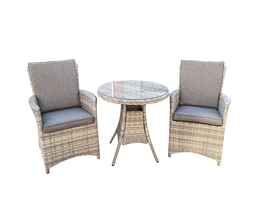 The Anfi 3 Piece Bistro Set is an elegant and intimate dining solution in stylish grey rattan, perfect for smaller patios, balconies, or garden nooks. This garden furniture set is made from the highest quality 2-in-1 flat polyethylene wicker, meticulously hand-woven around a durable powder-coated aluminum frame. Designed for longevity, this low-maintenance set is weather-resistant for year-round outdoor use.