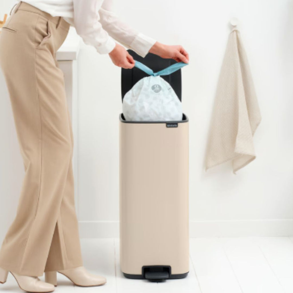 Do you want a great bin with maximum style? This slim Brabantia Bo Pedal Bin in 30 litre is beautiful on the outside and inside alike. Space-saving, with hygienic pedal operation and a lid that closes gently when you're done - no order is too tall for this slim beauty. Time to clean? Remove the inner bucket and carry the bin by its transport grip. There's even a stay-open function to help you whizz through a clean-up with ease. This tall, handsome household helper fits closely to the wall too. Go for Bo!