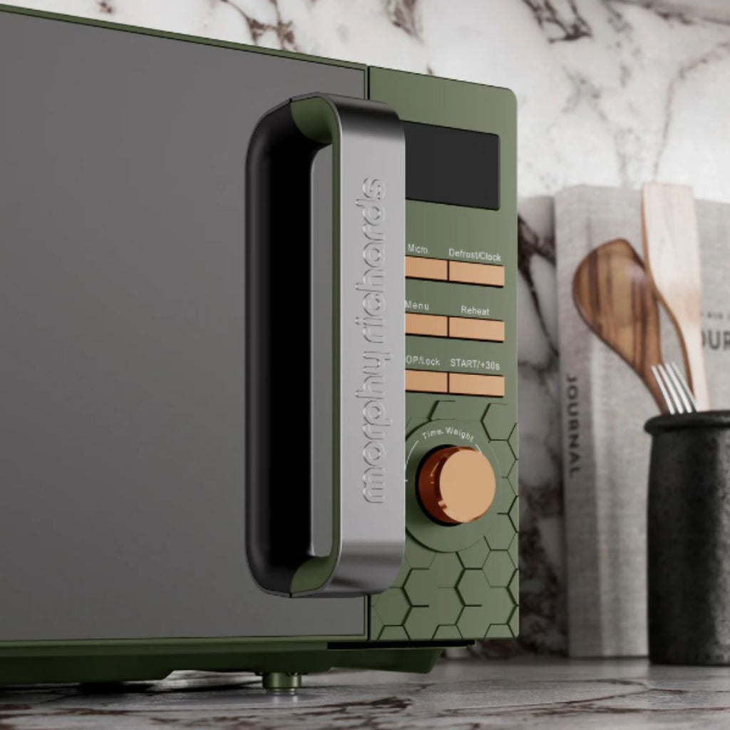 The perfect kitchen essential, the Morphy Richards Cassini 20L 800W Digital Microwave is designed to handle a variety of cooking needs with efficiency and style! The Cassini range features a distinctive hexagonal design across the kettle, toaster, and microwave, creating a cohesive and modern aesthetic for your kitchen.