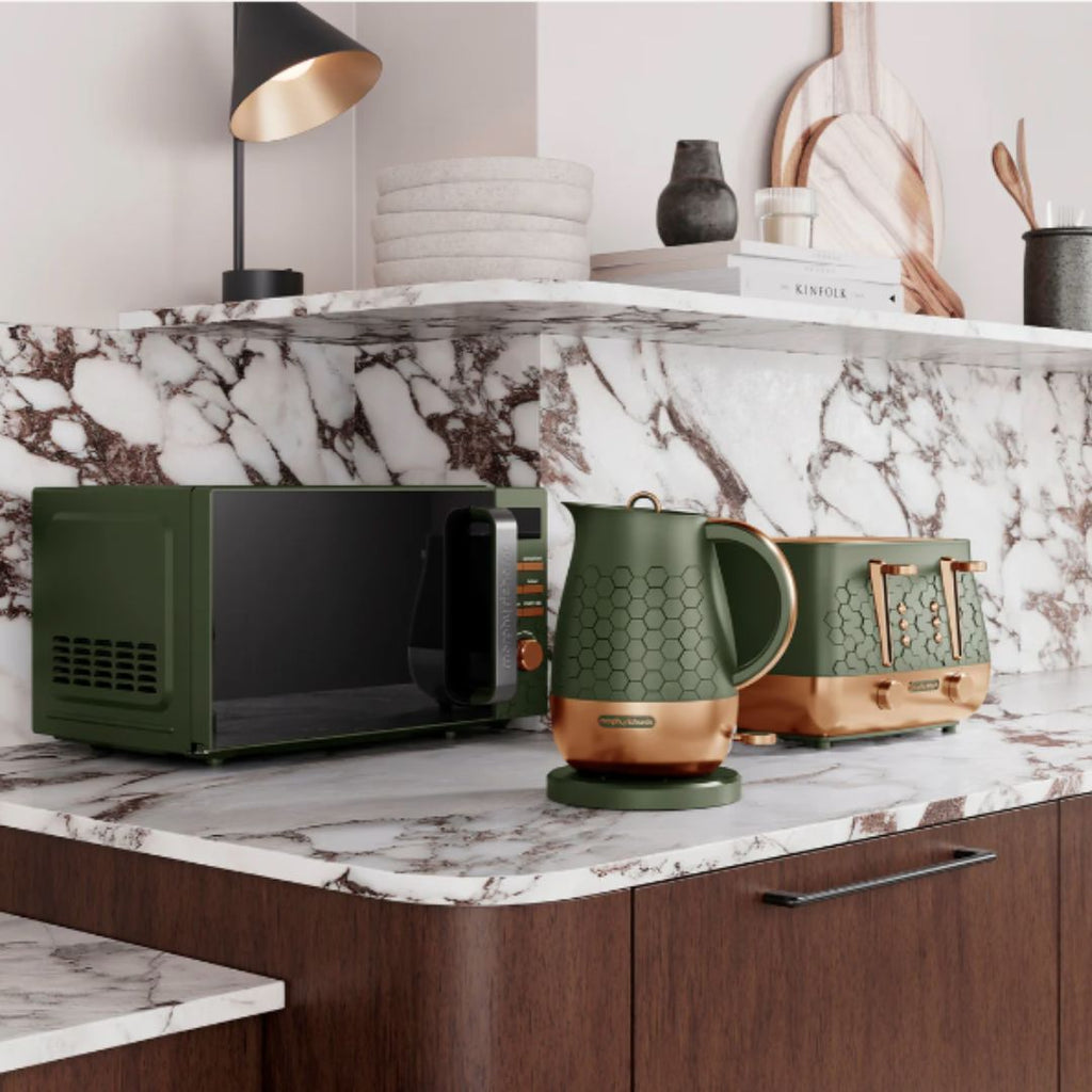Its spacious 20L capacity and 24.5cm glass turntable easily accommodate full-sized dinner plates, making it perfect for family meals and reheating leftovers. Further features including the 95-minute timer, end-of-cook signal, and 6 power levels including a defrost function add convenience to every use. There is no denying that this Morphy Richards microwave is an ideal choice for those looking to upgrade their kitchen. Complete your aesthetic with the matching kettle, toaster, and microwave set for our Cassini range!
