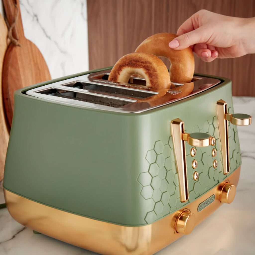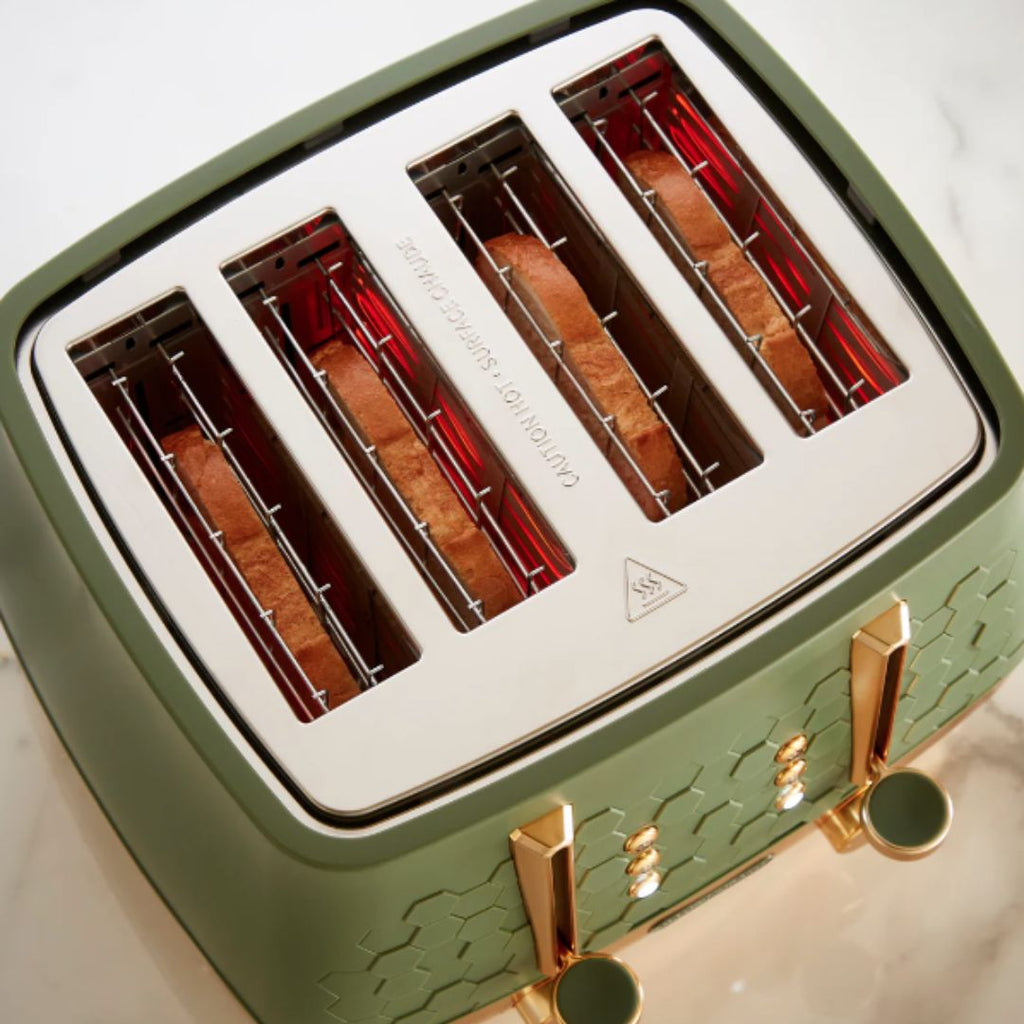 If you’re looking for a new toaster, look no further than the Morphy Richards Cassini 4-Slice Toaster! Our green toaster features a distinctive hexagonal design, creating a cohesive and modern aesthetic for your kitchen. Combining premium quality with a modern design, our Cassini toaster is crafted with multiple features to ensure a user-friendly design, this high end electric toaster will certainly make busy morning breakfast routines much easier. For instance, the high lift function allows easy and safe removal of smaller slices while the variable browning control lets you customise each slice to your ideal crispness. Not to mention, effortlessly keep your worktops clean with the convenient removable crumb tray while the illuminated control buttons offer a sleek, modern touch.