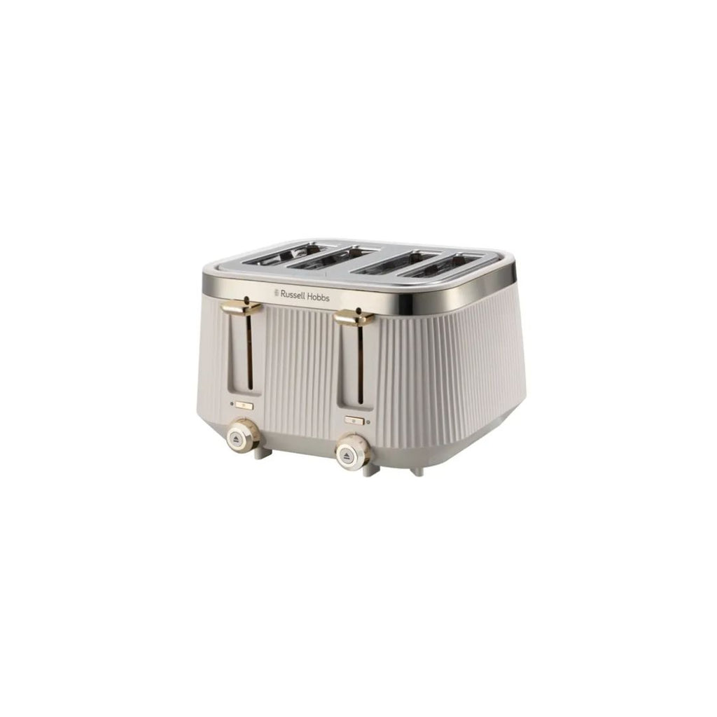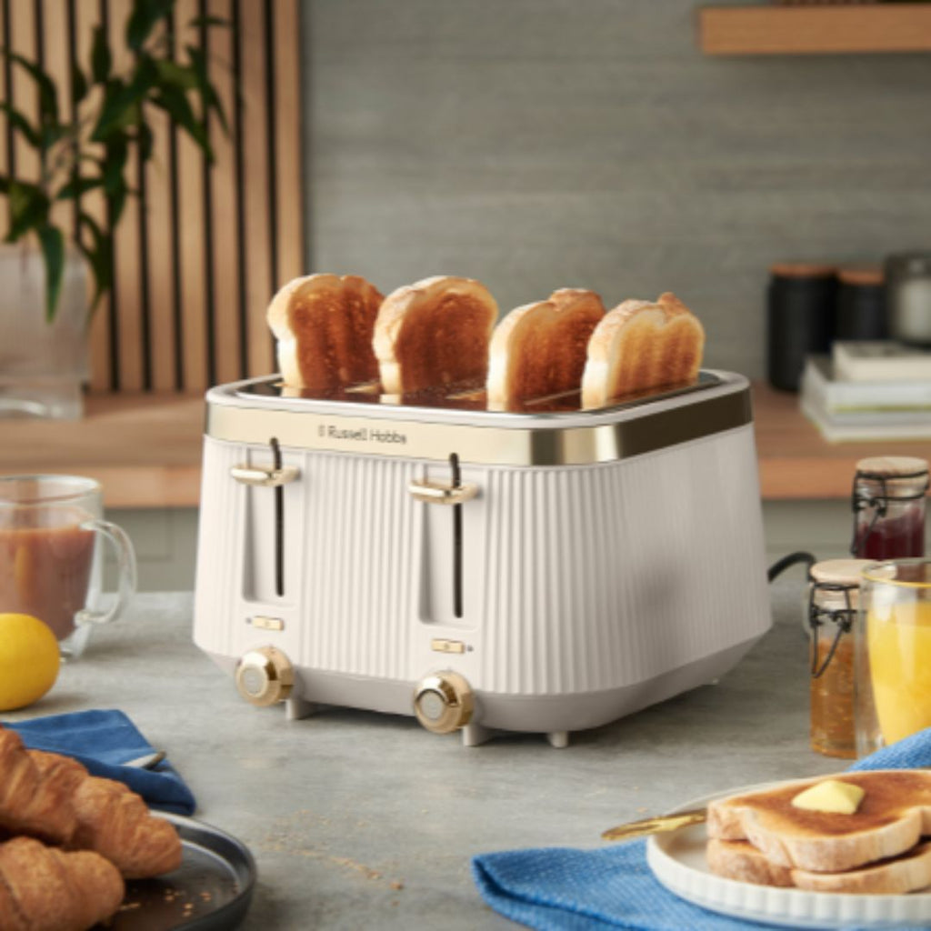 The stone textured design and gold brushed stainless-steel accents give the Russell Hobbs Brontë 4 Slice Toaster Stone a touch of class. Check on your slice without stopping the cycle with the Lift and Look feature and raise toast with the high lift feature. The frozen, reheat and cancel functions allow you to create the perfect slice, and the indicator light will glow until the pop.